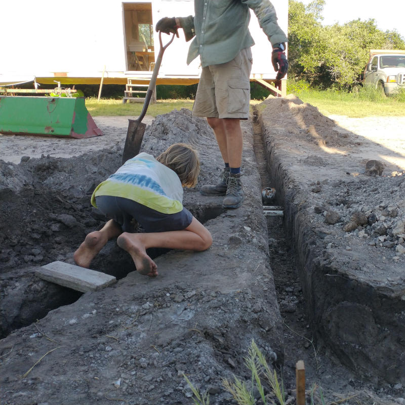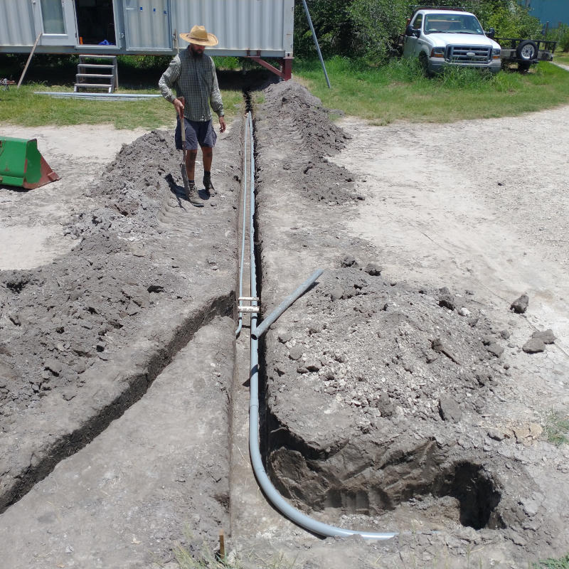 Then there is the eight to ten feet trench that cannot be dug with a tractor or regular shovel and must be dug by hand with a garden shovel. Eight to ten feet at eighteen inches in depth running from the edge of the dwelling box the the PVC pipes coming out of the utility space. Luckily the sand under the box is not filled with rocks and there are very little residual roots to break through.