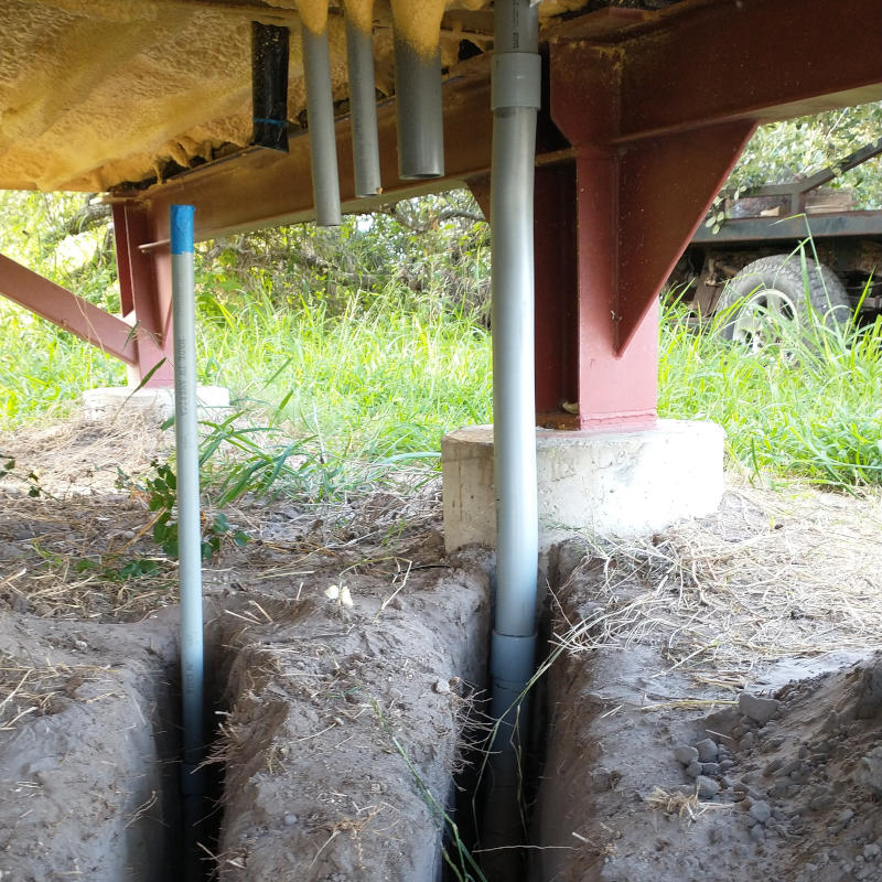 The great thing about laying PVC is that we are old hats at the job. So while the Planner is working on portion I am working on another. In between the Kid is helping both of us, begrudgingly, but helping all the same. Another few specialized bends and the lines under the house are complete. Well, almost. But the ground work portion is done.