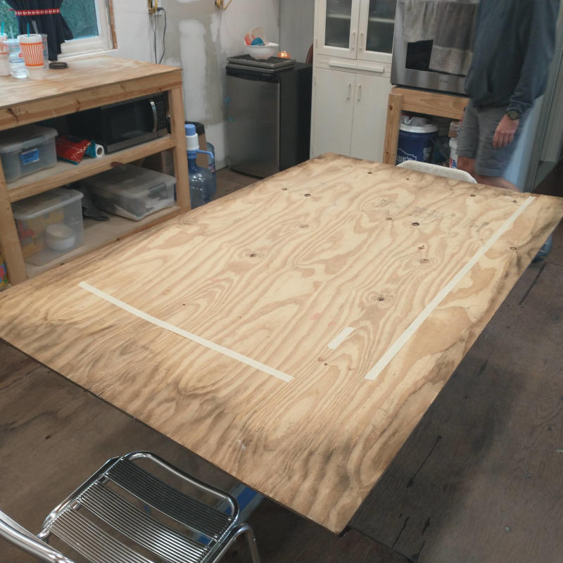 January started off great with the whimsical pantry knobs. With the bathroom completed, the kitchen in usable presentation, a bench for guests to sit at, I decided the next piece of functional furniture was going to be a table. A real table where six full size adults can sit comfortable, where a 1000 piece puzzle can rest while still offering space for the three of us room to eat, a table with real chairs. Using a little rinky dinky plastic card table was bringing down the feeling of the room. Every table we sat at was measure for width, for height, for thickness. I want something solid and sturdy, warm and inviting, functional and fabulous. Placing a sheet of 4×8 plywood on the card table for three days help to solidify table size. No smaller than 3-1/2 x 5-1/2 and no larger than 4×6.