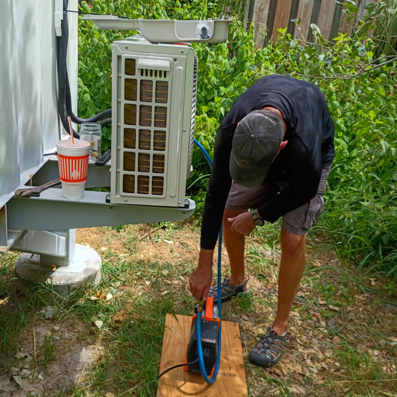 The compressor was charged and the lines tested for leaks. Testing for leaks is the longest portion of the whole process. If there were no tests needed, the mini-split could be installed in two or three hours tops. Testing requires a 24hour period. Once it held to the manufacturer set readings, the mini-split was ready to test. Brrr, standing at the kitchen sink now receives cold air from both mini-splits. Quiet, cold, and hopefully efficient. Only time will tell.