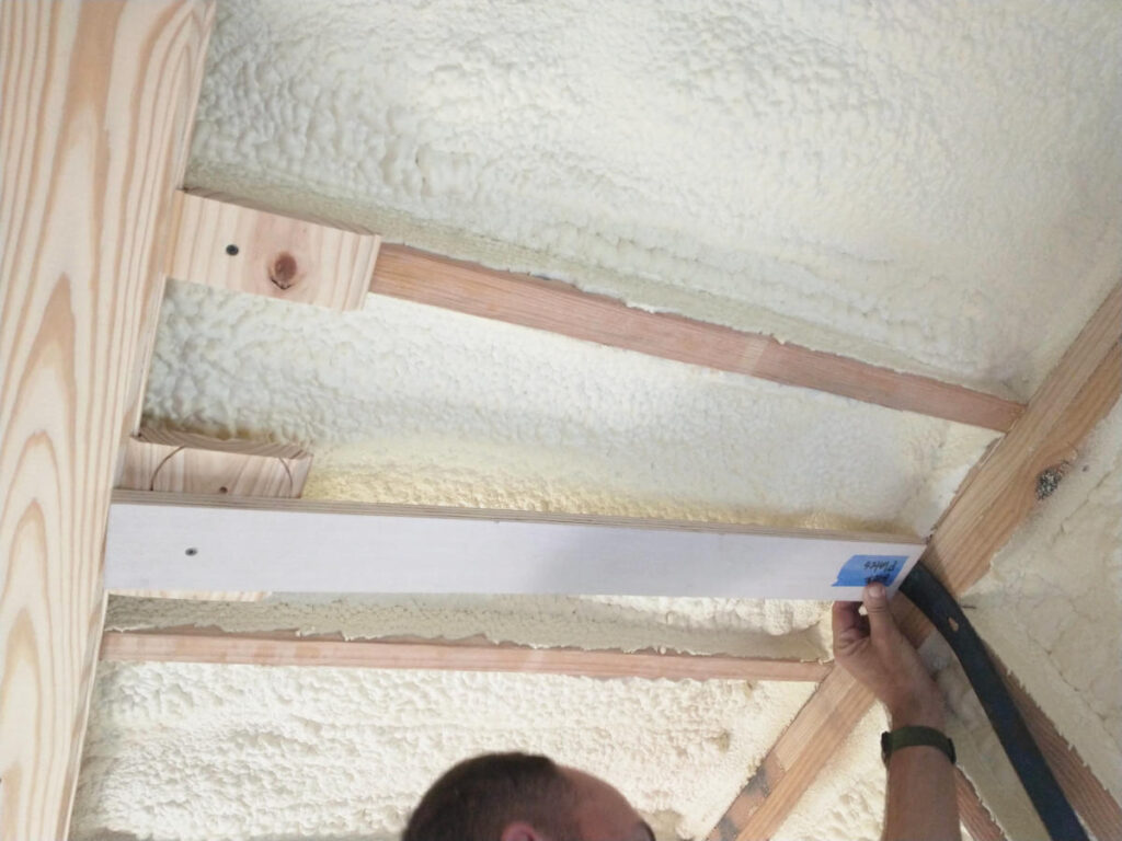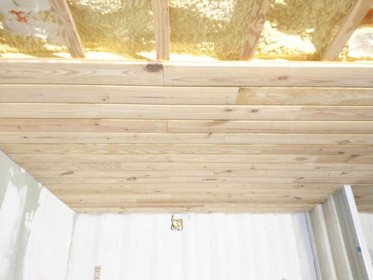 At the end of the fourth day, the ceiling had reached the bedroom wall. Creating a sliver of a ceiling board and very little ways help secure the un-grooved side, the final section was sort of just pushed into place and nailed as if it were a full section. There is still the wall board going up plus the trim so the chances of this 1-1/2″ board falling out was slim.