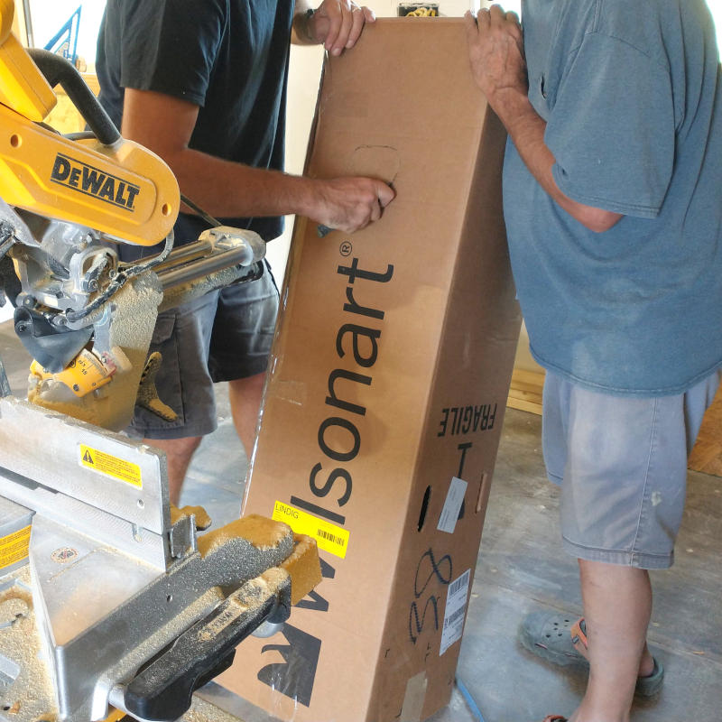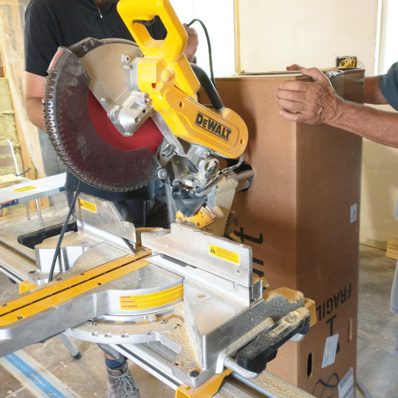 Before starting the very next morning, I decided we needed to find some way to collect the saw dust. It took too much effort last week to clean up just to have more thrown everywhere. Understanding the dust collection system never collects 100%, I simply stated anything was better than nothing. While they were over there discussing 3″ piping or bags or whatever I retuned with a giant box. After taping the handle holds from the inside and cutting a insert point, the box worked fantastically. Should have thought of this months ago.