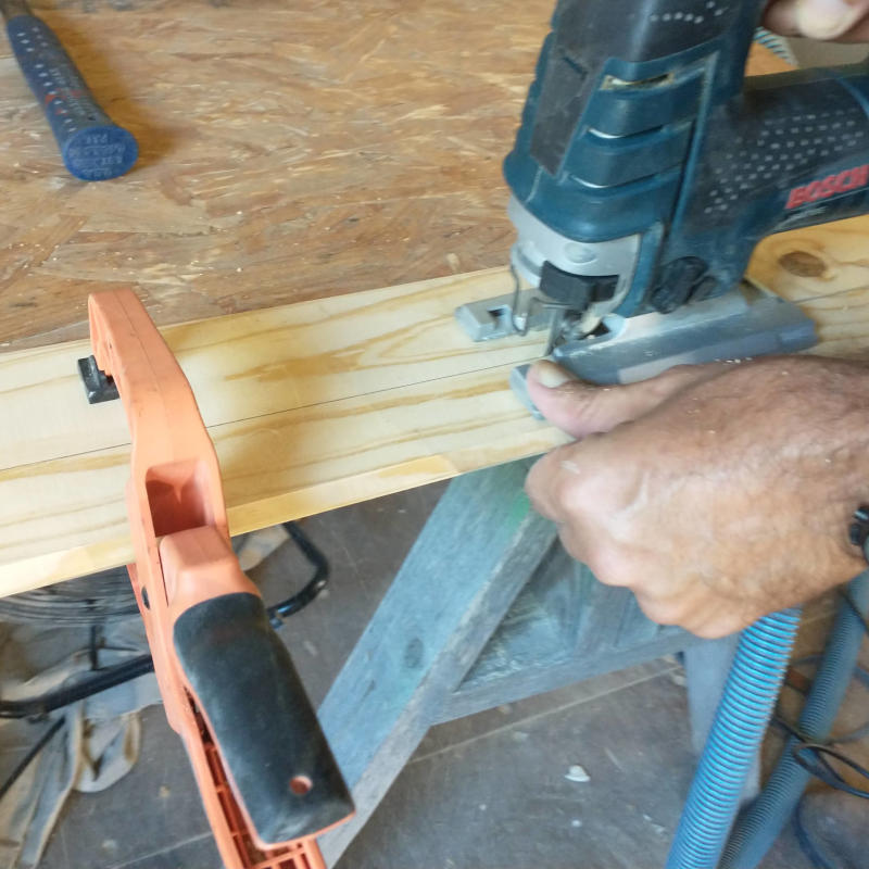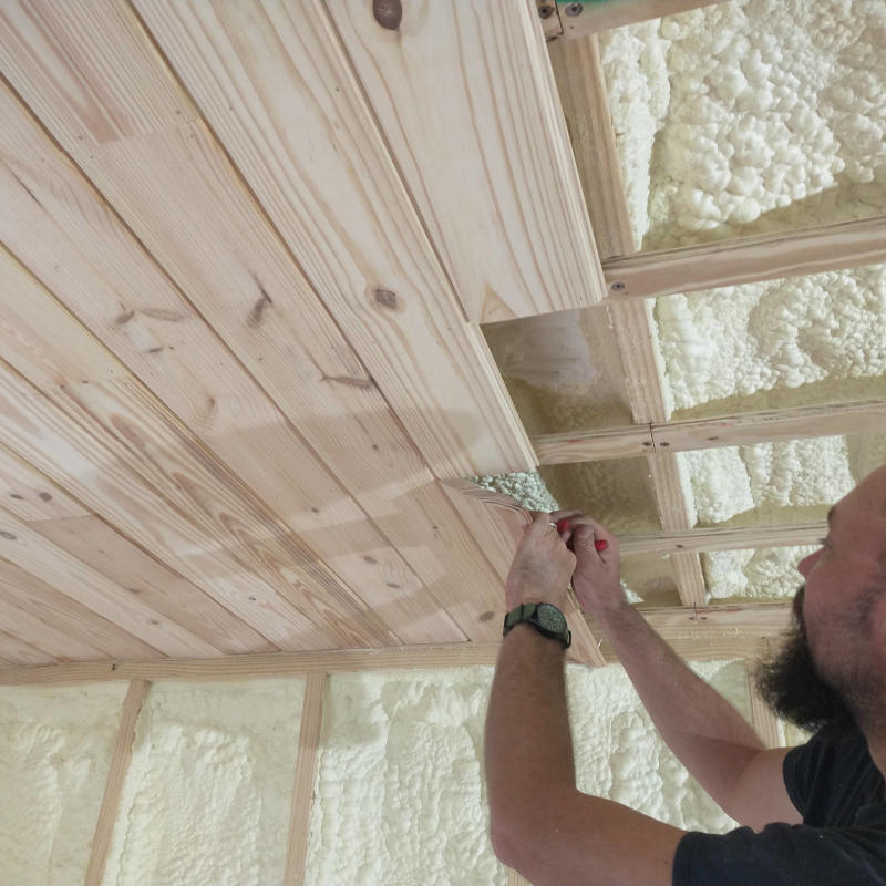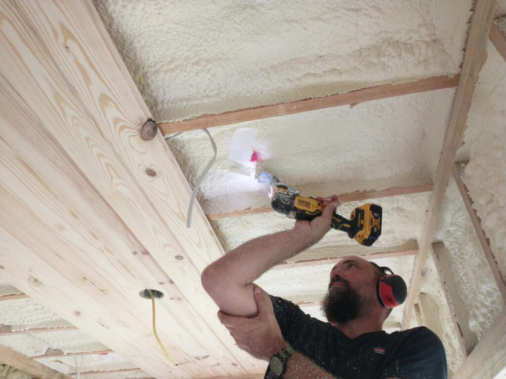 Unlike the rest of the dwelling, the bedroom was being completed in long sections with only two people. This required us to work one board on either side of the light at at time. Boards being 11′ long really require the use of set of holding hands and one nailer. Without the Planner I was unable to hold the entire length by myself with the Planner handling the nail gun nor was I able to hold the board with one hand and manage the nail gun with the other. When a problem is at hand, the Planner delivers a solution. In this case, an arm. This third arm used a small 10″ section of tongue and grove board screwed to a 3″ leftover trim board. Working either side of the fan one board at at time meant every board resulted in the arm getting smaller and smaller as we get closer and closer to the wall edge. It worked so well, the Planner built a second one meaning there were four sets of hands holding up the boards with perfect tension for nailing.