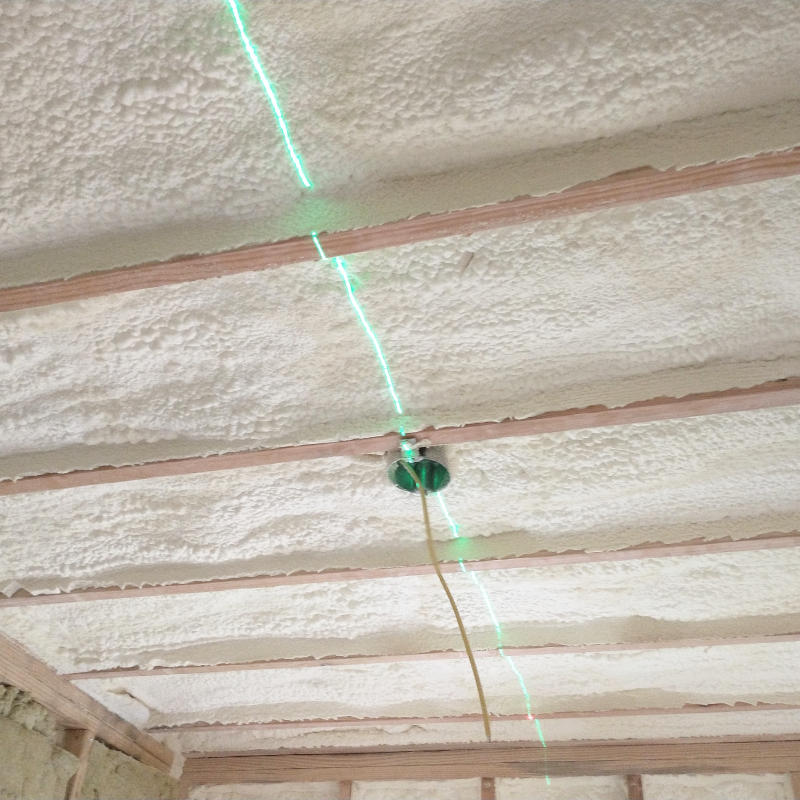 Day six after some debating over directional layout of the ceiling using the laser line as a point of reference, the final decision was made for us. Running the boards north to south would mean 1) runners would not have to installed as the original 2x4s could be used as nail points and 2) since there were enough boards remaining we didn’t have to cut small ceiling boards, the boards cut be whole lengths like in the bathroom. Both resulted in less work. Also, with the board running from the door to the window, the eye naturally follows the line inwards towards the back of the room (the north window, the headboard) creating a better focal point.