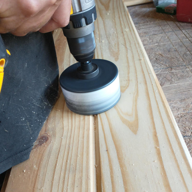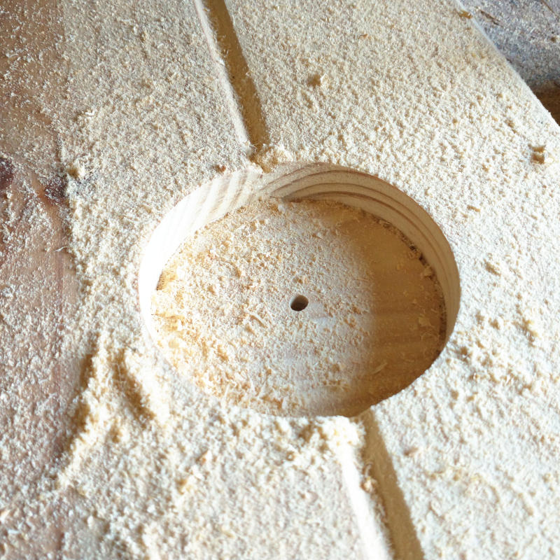 Starting at the center of the room and working out the first two boards were clamped together and had the fan outlet box removed with a giant hole saw. I was so worried the boards were going to try to split or get runners but the edges turned out nice and smooth with no need for additional sanding.