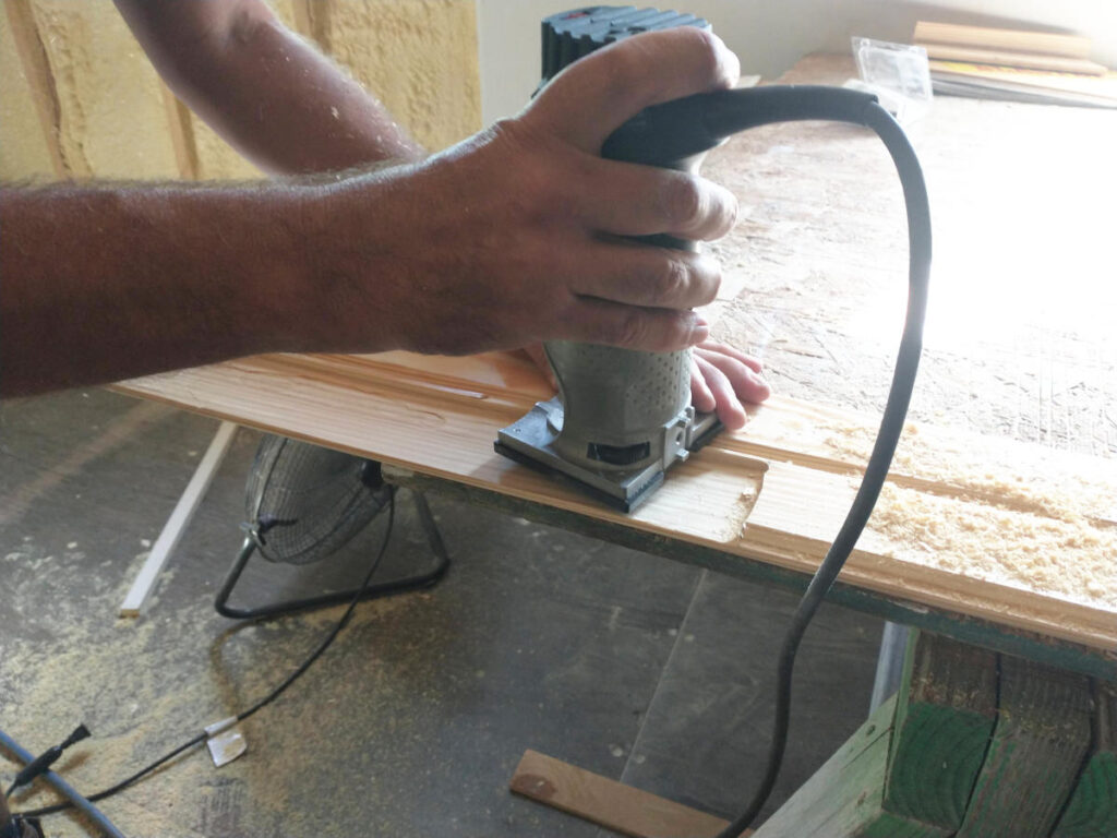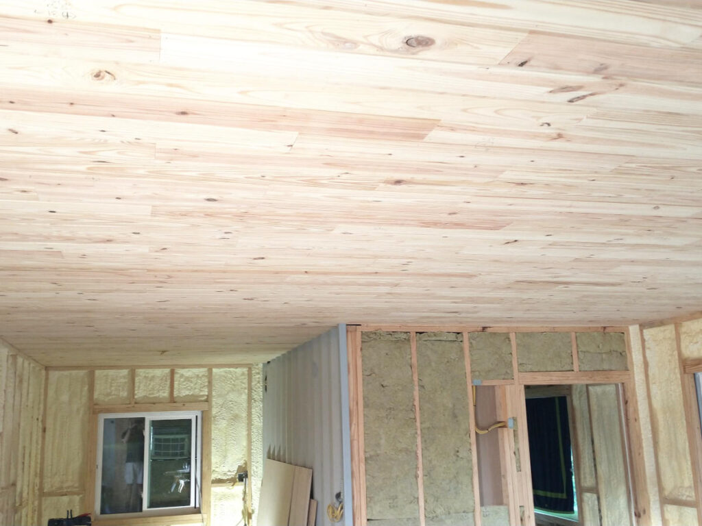 Always grief. This time it was the last ceiling board. At the edge where the dividing container wall meets the built in place wall for the bedroom there was a two foot section of inner fabricated beam. Only an 1/8″ thick, the last board had to be routed in order to lay flat and connect with the previous board. Testing a two foot scrap board, the Planner routed small amounts until the desired thickness was achieved. With trepidation on hand, the Planner routed out the last board. It needed to work as there was only one full length board left and it had a nasty knot. Fear not, the board fit snug as a bug especially since the 18″ were also glued onto the exposed metal plate since no nails could be installed.
