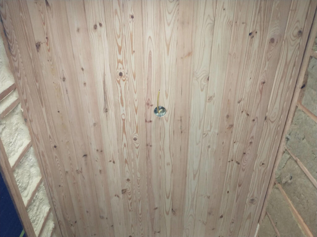 End of the second day we had only made it to the edge of the front door. About 16 ceiling boards. Eight boards on either side of the middle dividing wall needing corrugation fitting and then it was easy peasy with only the difficulty of determining how long what board should be remaining. Ensuring there was not a pattern to the ceiling took some effort at first but with time the process was being completed without thought.