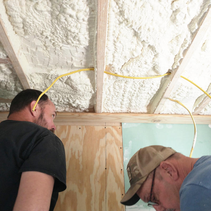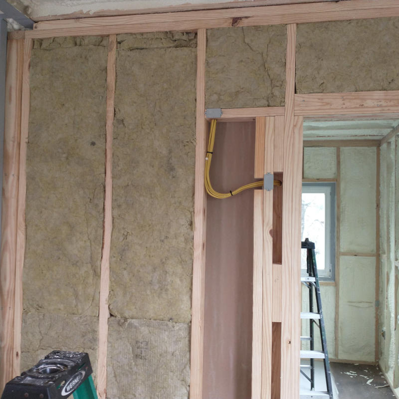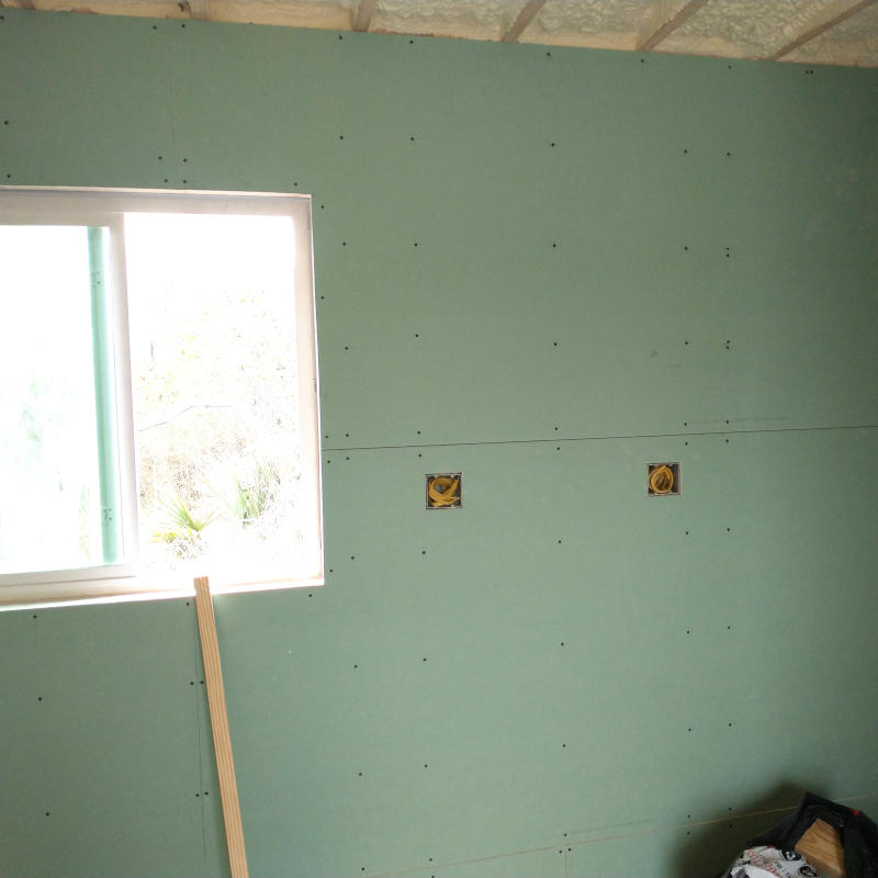 Day one, they finished rocking the bathroom and pantry. Then started and completed rocking the kitchen wall and installed insulation on the south wall of the bedroom facing into the kitchen area. A very productive day.