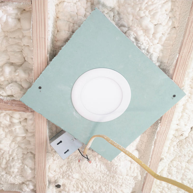 Needing more light, the Planner decided he would install one of the ceiling lights to see how and where the light illuminated. Kind of a test run for light placement. Installing a simple LED light seemed simple enough. Simple until they realized that there was no electrical wiring running in the ceiling for lights. Oh, sure there was electrical lines coiled up and hanging all over the place but there was not actually any lines running through the ceiling joists. Holy. E. Moly. This was a major setback in the plans.