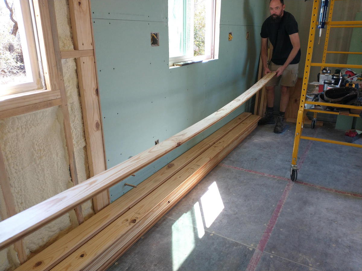 Ceiling work started on the far east wall where the distances where shorter just after lunch. This allowed the hangers to get their bearings on how to hold the boards in place while nailing. Pushing boards were created using dropped pieces of tongue and grove ensuring the edges were set tight into place without damaging the groves. It took several iterations to determine what length worked best with the amount of leverage being applied to such a delicate edge. Boards ran north to south to give the illusion the room is bigger than it is really is with whole continuous boards, no splices. By dinner the bathroom ceiling minus the cutouts for the lights was complete.