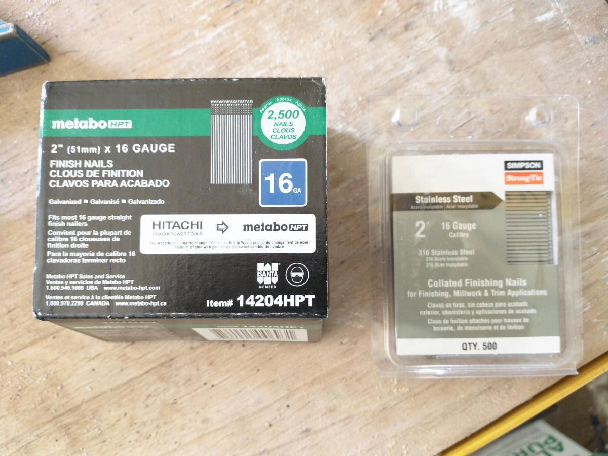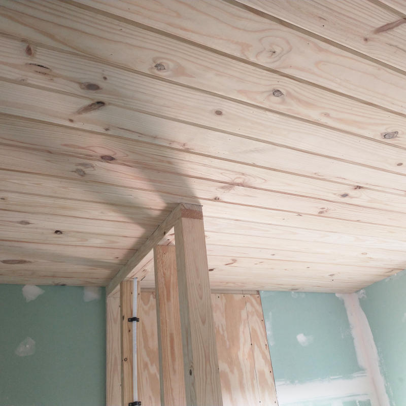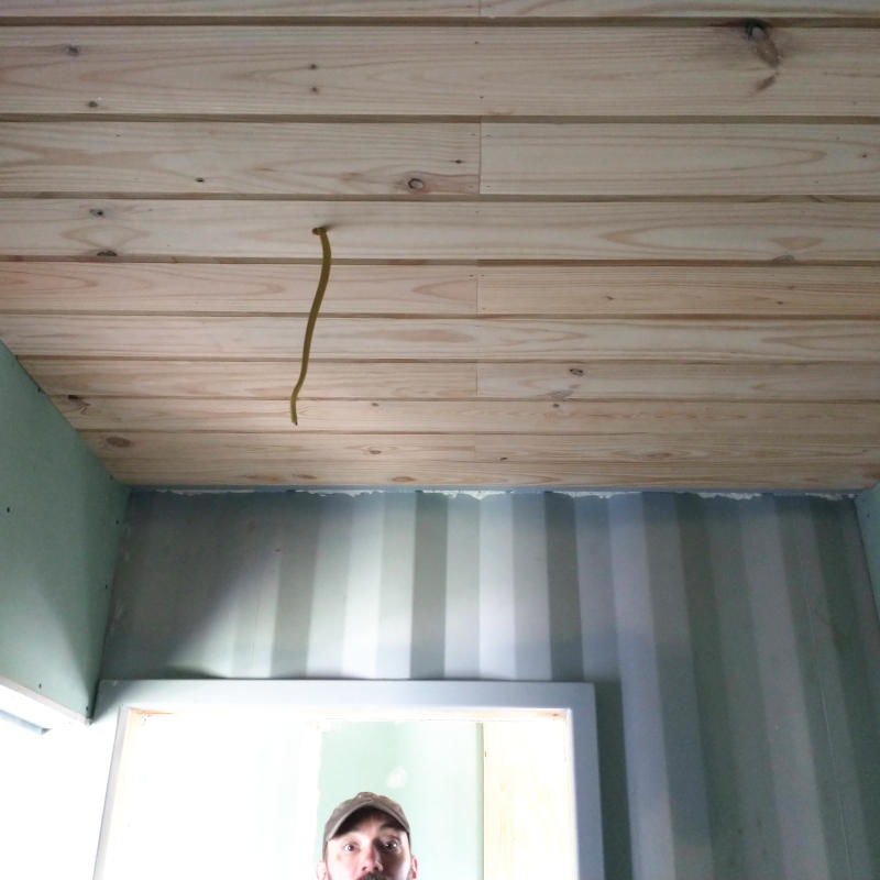 With electrical wires in place for the three bathroom lights a trip was made to the next town over to a local hardware store to purchase ceiling boards. All four of us piled into the truck took the 45 minute drive over one way to view and select 2x4x16 tongue and grove pine boards. Boards that are 16′ in length are very bendy. Great care was taken when selecting them to ensure the edges were not damaged as the grooves are broken during shipping, in selecting them to ensure there were not too many large knots or knots on the edges, in selecting them for straightness. Between the Planner and the Doubter then myself and the Kid who has a great eye for detail work like this we must have looked through a hundred board to only come home with a dozen and half or so. Purchasing boards was easy compared to the debate over standard galvanized nails or stainless steel. What is the difference, you ask? Well, first and foremost, pricing. The standard black cardboard box all carpenters use costs WAY less than the itty, bitty, tiny plastic box used for specialty projects. Most would argue, the Doubter included, that ceiling work is not specialty work. Normally they would be correct. Normally. Nailing the bathroom qualifies for specialty work. The ceiling boards will not be painted to protect against daily moisture. And, as you should know by now, EVERYTHING rusts at Boxes in Fields! Galvanized pipes rust in concrete and fall down everyday so why wouldn’t galvanized nails rust out in a warm, humid bathroom resulting in the ceiling falling down? Exactly my point. So while these stainless steel nails cost more than an entire box of galvanized nails they are worth the long term gains.