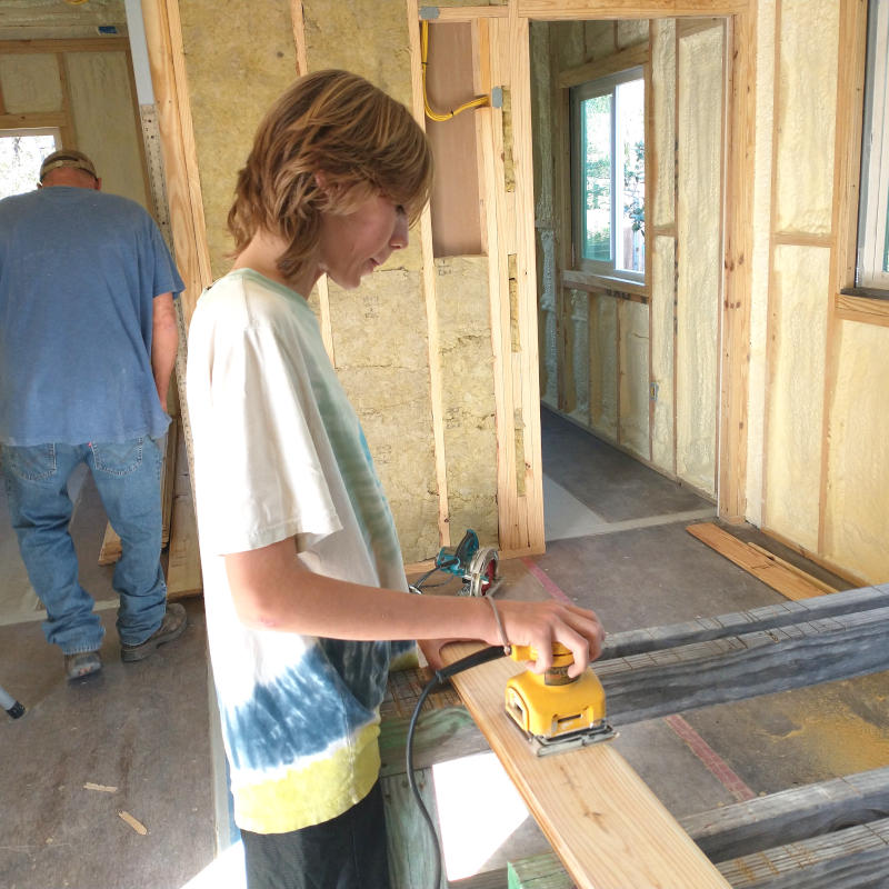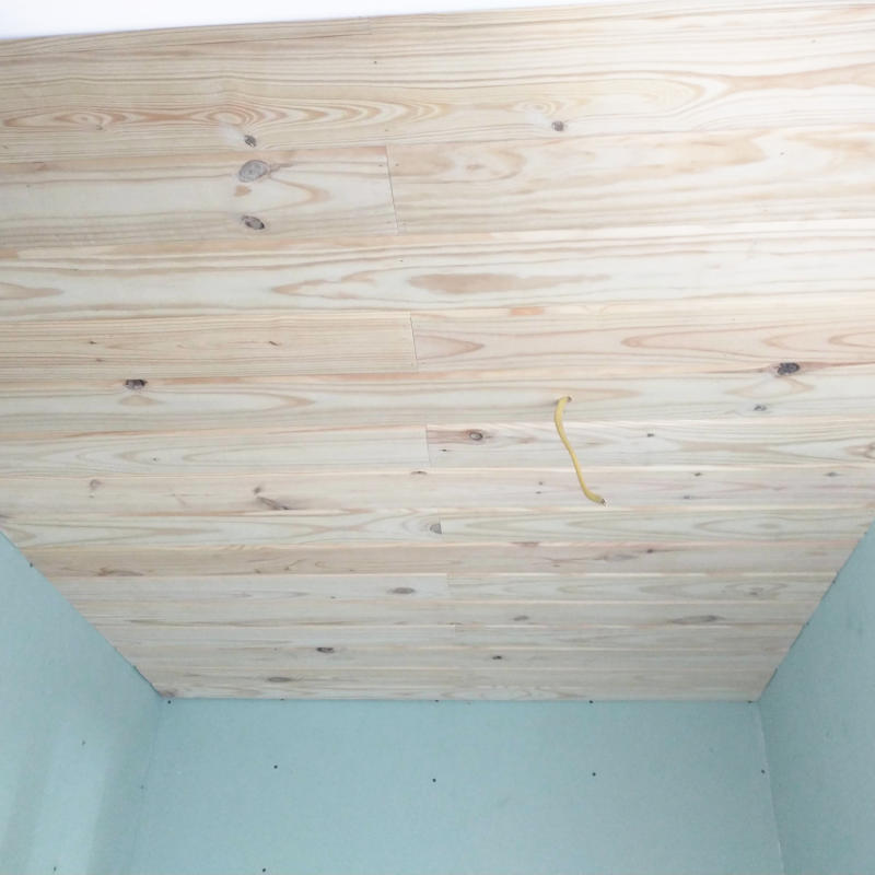 Having four workers made for quick work. There was a whole system. Boards were cut, then passed over the to the Kid for sanding, then the Planner and Doubter hung and nailed them into place. Every fourth board or so the length of the ceiling was checked otherwise all moved with ease.