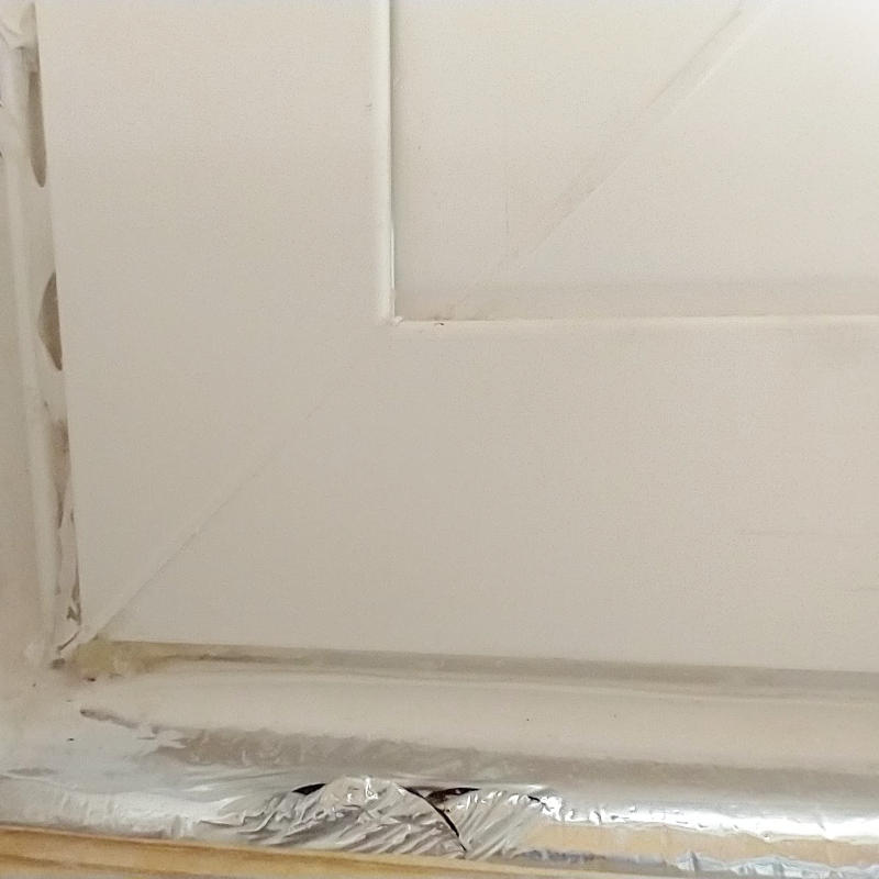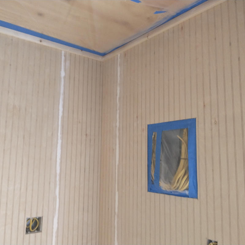 Trim installed, bead board butts smooth. Tape at ceiling edges and around electrical panel. Electrical outlets are not covered as they will be trimmed and covered with a plate anyways. Windows taped at edge, then covered in plastic at plastic edge giving the tape a three inch width. Paint on bead boards good, paint on windows is a mess to clean. Not even sure how to remove paint safely from the vinyl window trim. Let’s not forget how much work I already put into cleaning the windows.