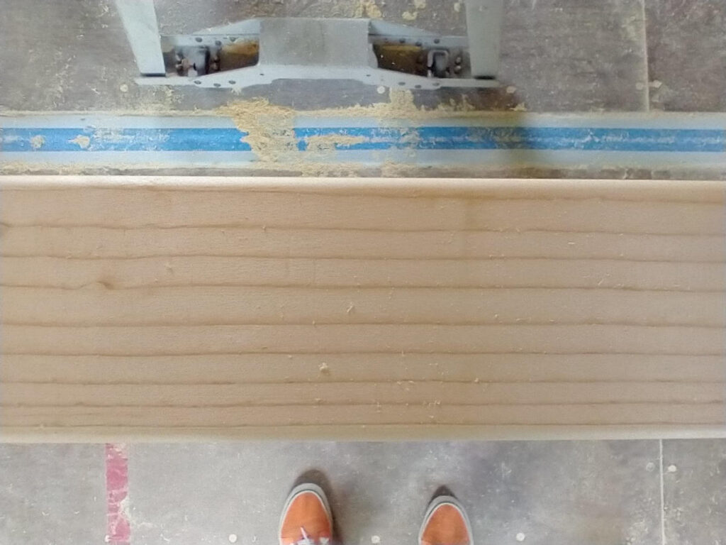 Before trim could be installed windows had to be cleaned of rubber gasket materials encompassing every corner. I guess the manufacturer thinks all window trims are placed at the windows opening but I like the look of trim, window base, then glass. Removing this material was so, so time consuming. Chemicals could not be used as the windows are vinyl. A paint scrapper was used with a very rounded almost blunt edge. This one window took almost an hour and there are five more to go. UGH. Next a table saw had to be borrowed as the 2×4’s being used for trim would need to be grooved in order to fit over tile and cutting proper angles. Off to Not the Doubter’s for his table saw. Wanting to play with the settings and get a feel for the nuances, the very first trim board completed was the bathroom window. It was a simple cut resulting in the need for a new blade. Look how chipped the edge was.
