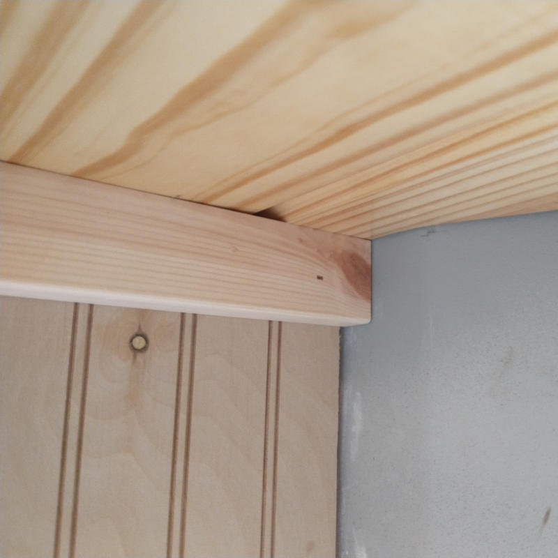 Windows, door jams, and ceiling/floor trim are easy to measure, easy to install. It was the width that gave us pause and corner styling that gave pause. Should the corners butt into each other or should they be cut angles? What size should the trim be? Six inches seems excessive, four clashed with the width of the ceiling boards, three was size of the window trim and that was based upon spacing issues around one of the windows in the kitchen, and two was larger than the bead board spacing and just over half the distance of the ceiling boards.