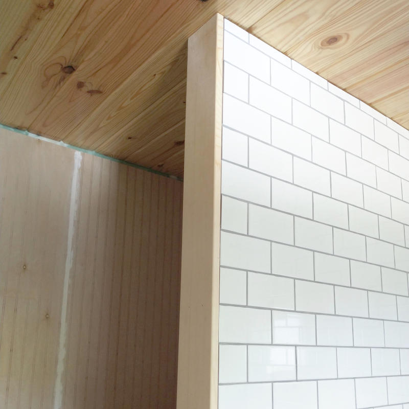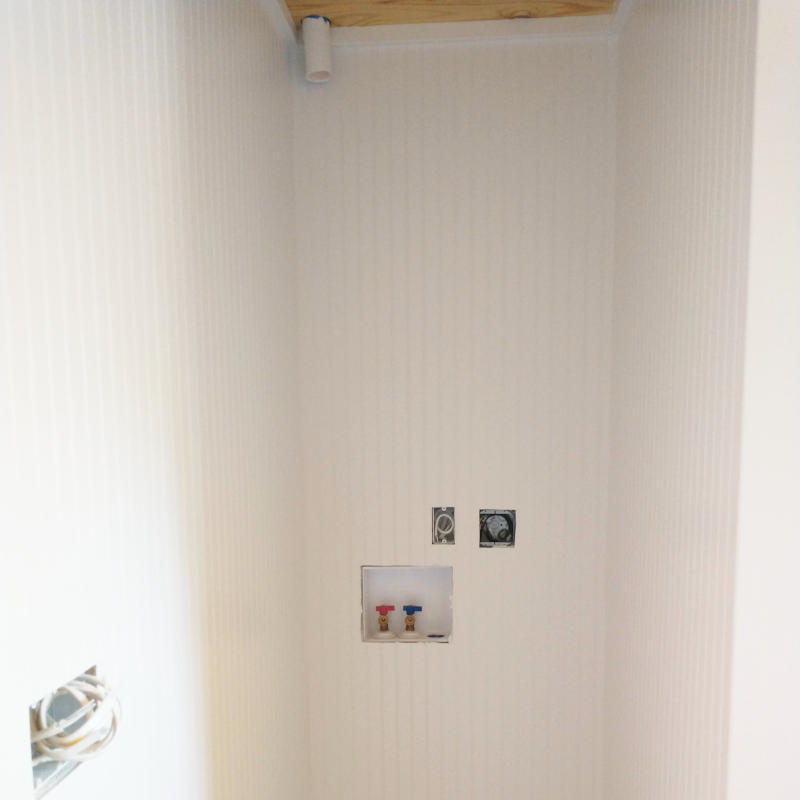 And what about the missized tile? What was the solution? Nothing. I decided it was such a minor amount it would hardly be visible once the shower stall was in place. Liking the results when nailed next to the tile, the shower/washer/dryer wall was trimmed.
