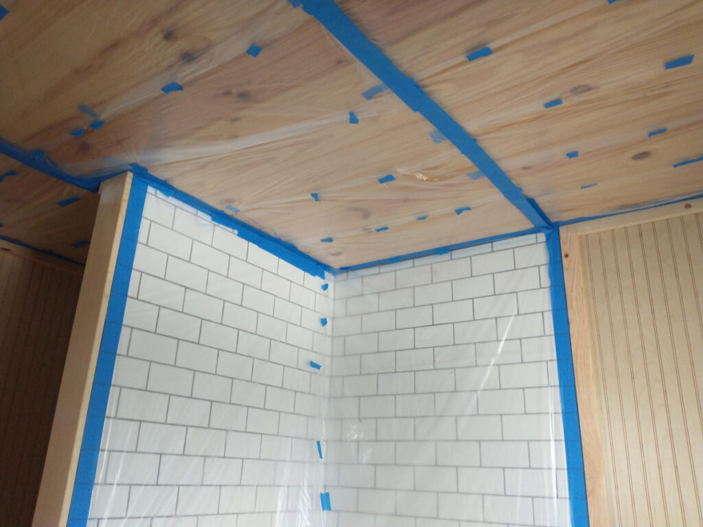 Tile, ceiling, and metal walls were taped and sealed off. Since we didn’t have access to one solid section of plastic sheeting, the strips had to be spot tapped along the way. The ceiling has chicken pox scars.