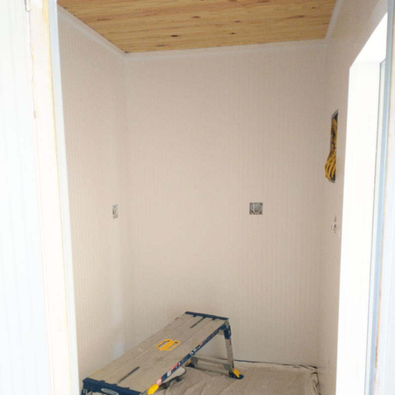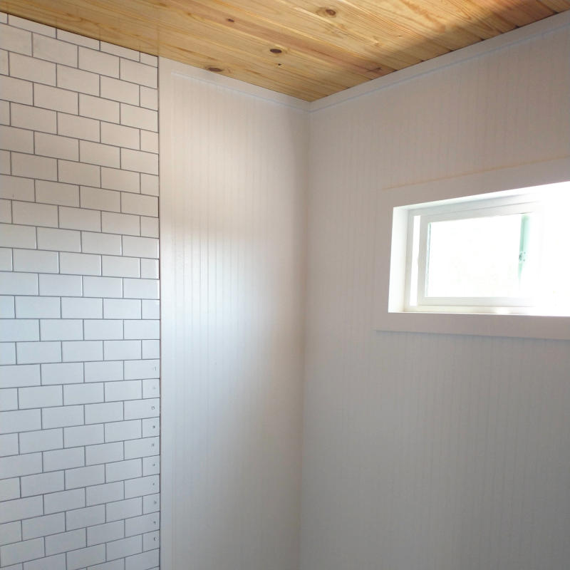 And for those who kept telling me white was a bad color for a room, let me say this snow white is just what the room needed. Colored walls are not for rooms this small, it would be claustrophobic. White horizontal tiles with white vertical bead boards makes the room feel open and bright while the floor and ceiling keep the room from being sterile. For those who are worried about color, just remember the chicken coop is lime green, the Work Box is vibrant green, and the Dwelling Box when done will be safety blue. Color will come later. Promise.