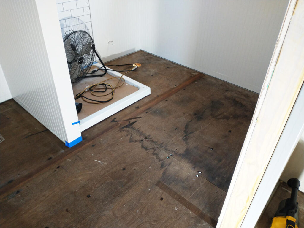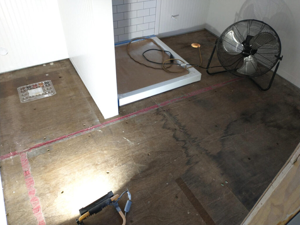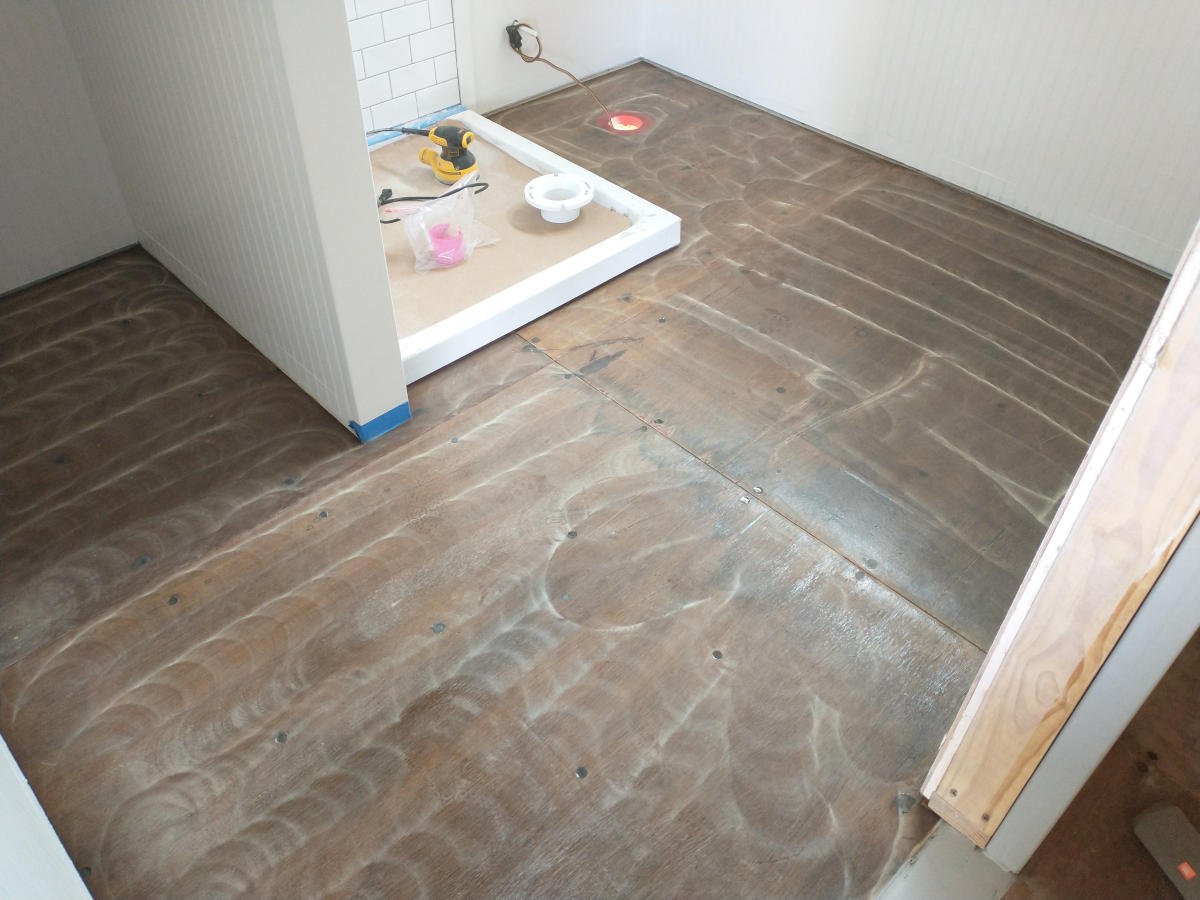 Removing excess epoxy was tricky. The grinder needed to be held flat without cutting into the plywood. Once completed, the floor was vacuumed, moped, vacuumed, and moped again. Sand and dust floats in the air and settles back onto the floor between cleanups. There was so much dirt in the groves and recesses of the plywood. It was a good thing the Planner ordered the large sample bag because this plywood floor was dry, dry, dry. Three layers were applied before the floor started to show a shine. Three layers!