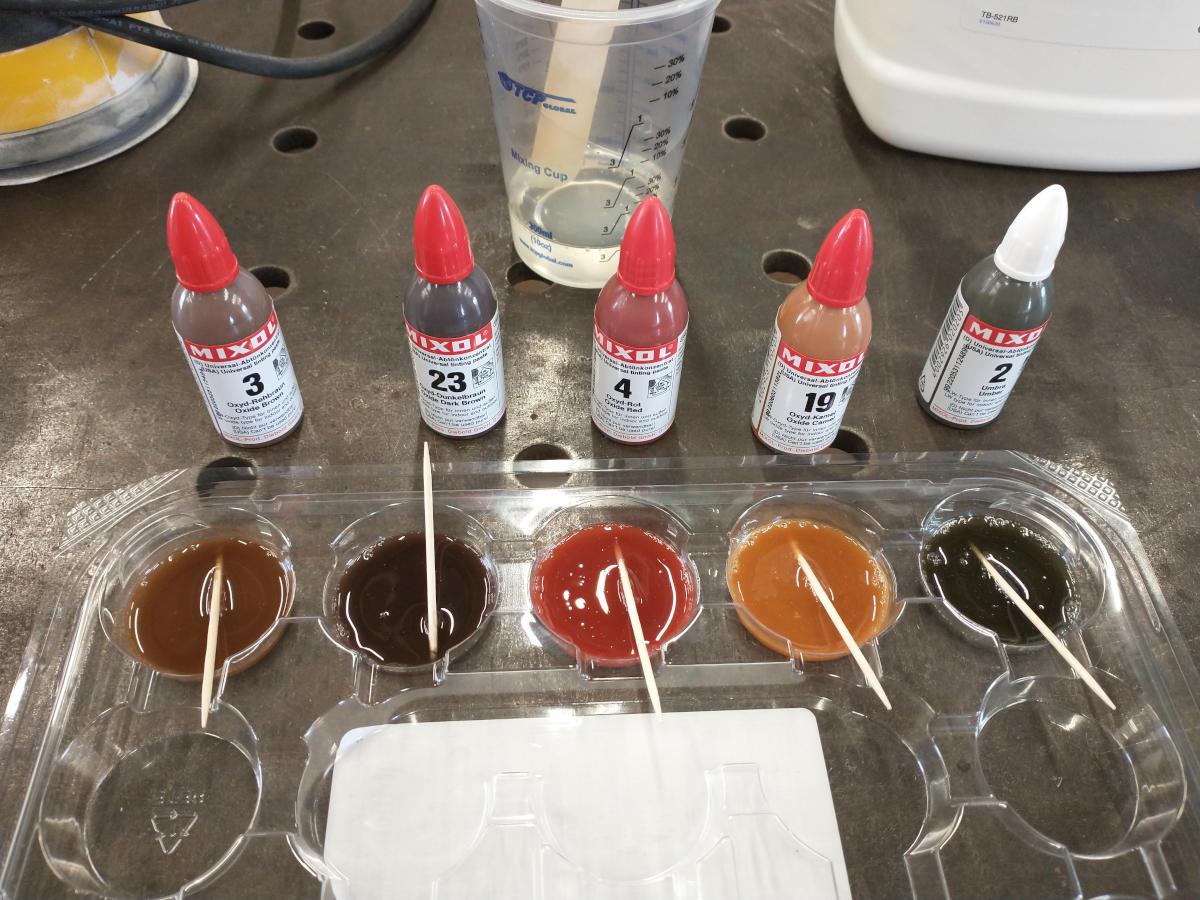 Again, like the two sample colors of waxed shellac, five samples of colored epoxy were tested to see which color best matched the wood. Epoxy was needed to fill in screw holes, plywood joints, and major scratches and dents. Final decisions laid either with a contrasting color such as the oxide red (#4) or oxide camel (#19) or a complimentary color such as the oxide brown (#3), oxide dark brown(#23), or umber(#2).