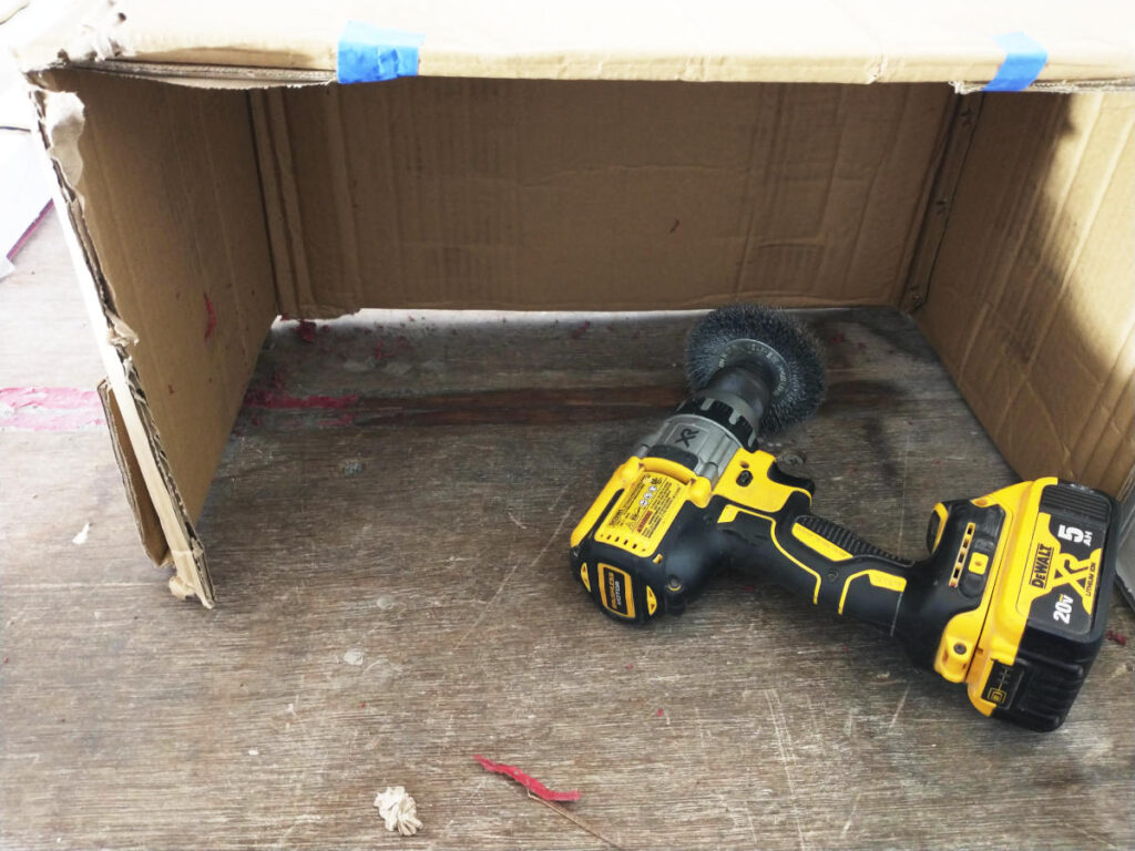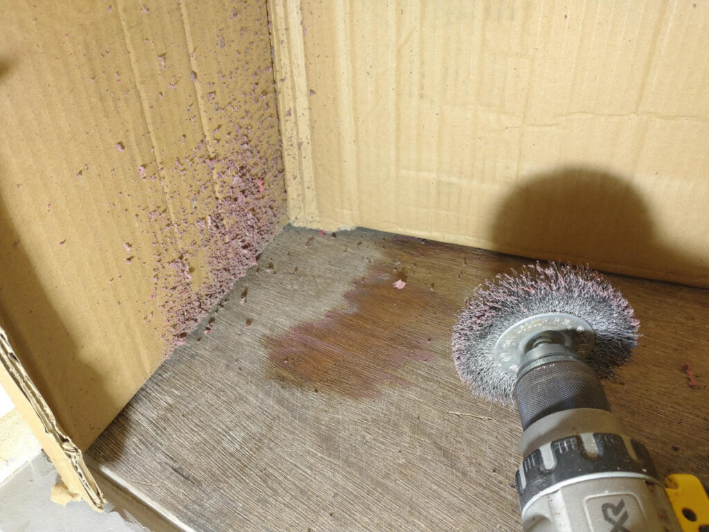Good grief, how this step is so messy. Not wanting pink sticky goo on the newly painted walls, a moveable work box was created to contain the flung residue and wire bits that broke free. A work box worked better than anticipated even if it required me to bend over in order to see clearly where the grinder with wire wheel was going.