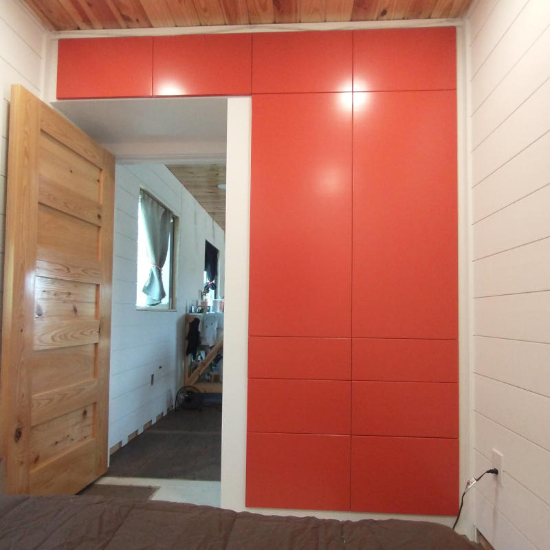 Bedroom cabinet doors have been in place since New Year’s Eve at 830pm, the drawers in place since the middle of January. Painted doors were started, completed, and hung before Valentines day. Cayenne, the first Sherwin Williams color that was not winter related. It matches the orange in the comforter perfectly. I know what you are thinking, the bedroom is supposed to painted with warm colors to relax. Red and Orange are energy colors. Trust me when I say pictures do not do justice. Cayenne orange is very dark and soothing and when seen at night they make the room even darker.