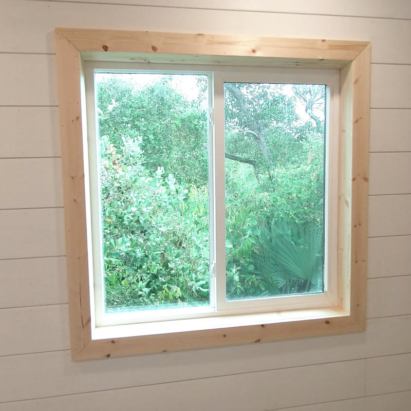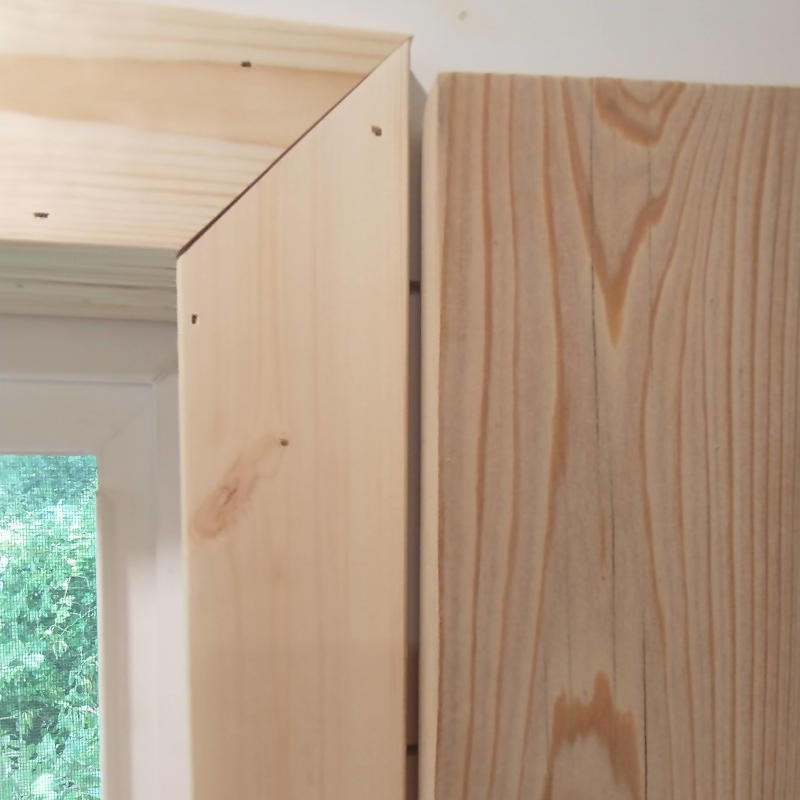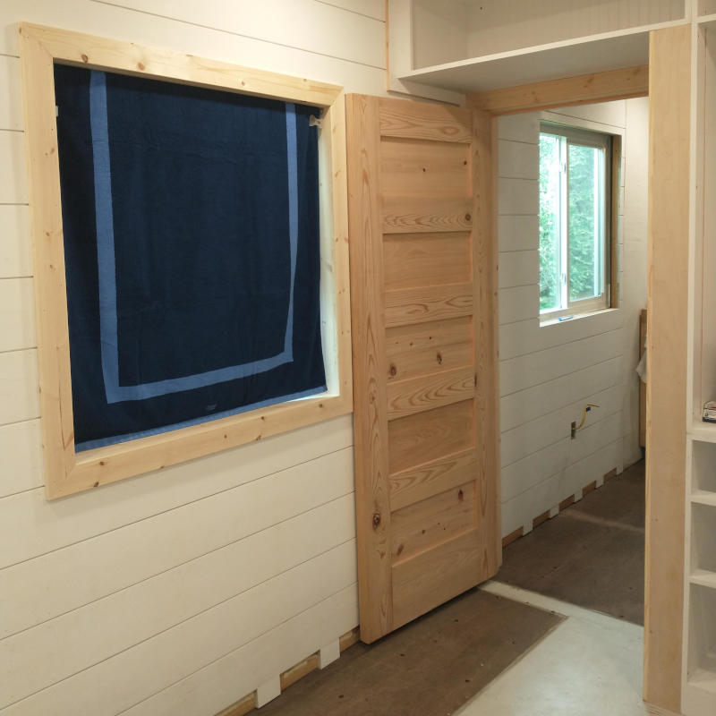 Next windows in the bedroom were trimmed. Umm, Planner. I don’t think the door is gonna close. Had to reinstall the unfinished door to assess the situation. Mere gaps. At best a 3/32″ between the trim and the door. Guess that is all that is needed anyways. Waste not, want not. Space is limited.