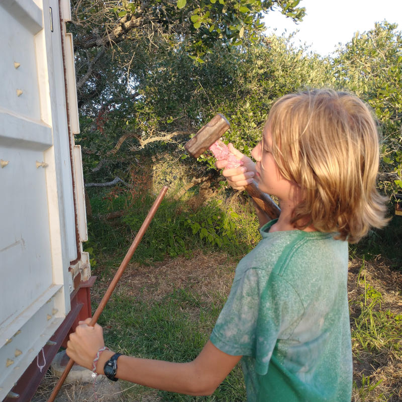 Hours later with the sun setting creating for photo perfect pictures, the Planner and the Kid hammered the 6′ ground rod into place. Again, spindly hammered for a few swings and then the Planner would take over. Taking turns for several rotations was getting harder and harder for the Kid. Five pound hammer finally took its toll.