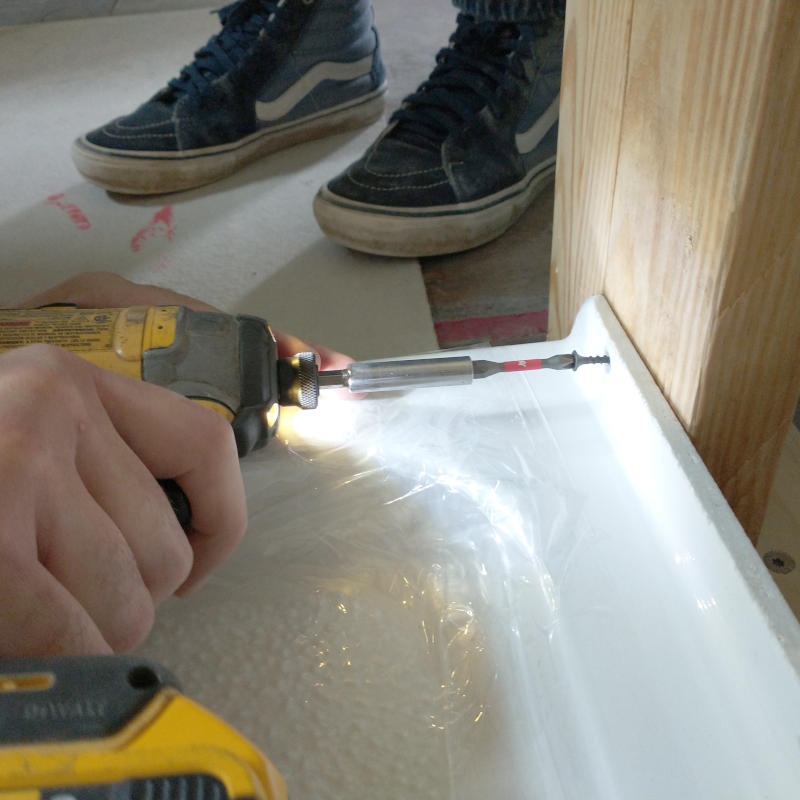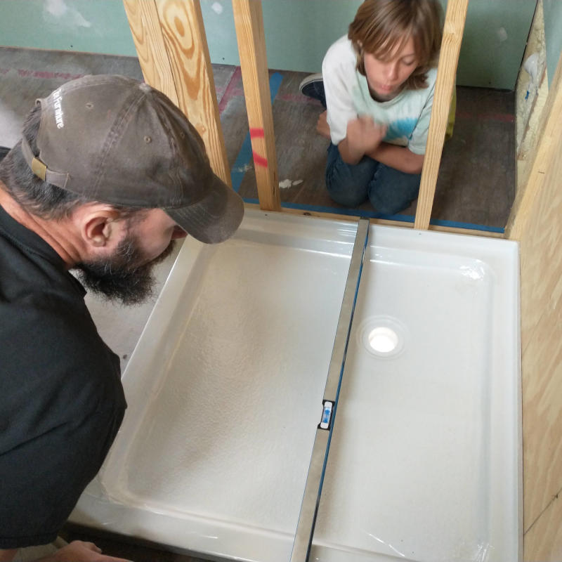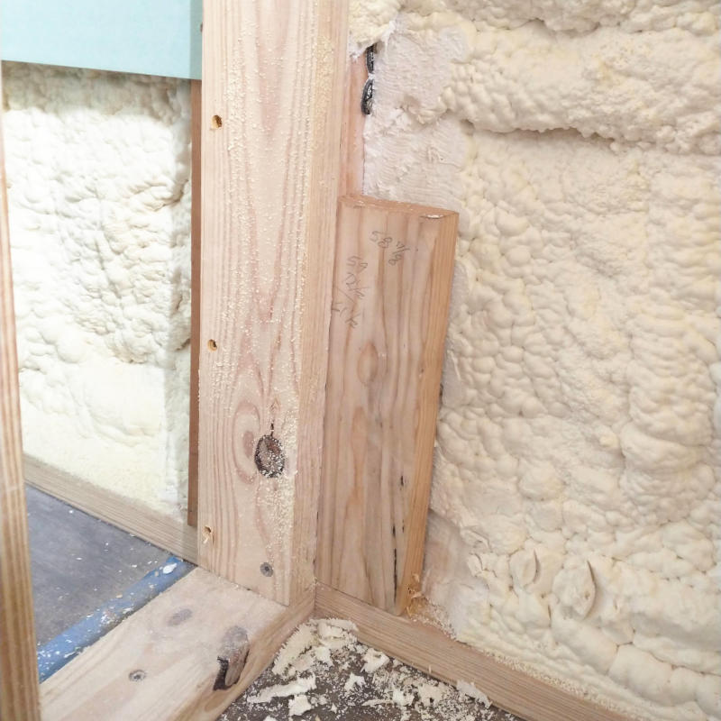 The shower base to specific. First more foam was removed to allow for the placement of a modified 2×6 the entire length of the shower wall. A backing board was needed to support the hardibacker and there was not any support for the wall. With foam removed the sections of 2×6 were installed and the 3/4″ plywood was attached to the wall. Second, the floor under the shower base it at the intersection of two sections of flooring that have become unlevel over time. Using a flapper disk on the hand grinder, the floor was leveled. Some areas was just a quick brush across, others required the floor to be sanded some distance away from the intersection.