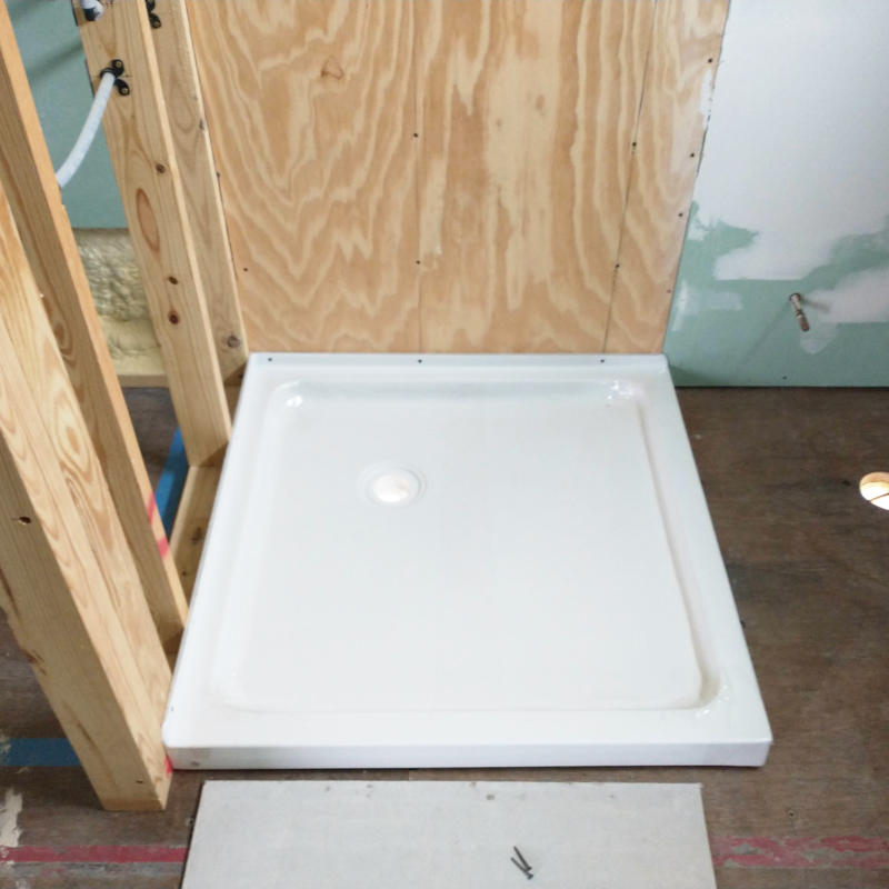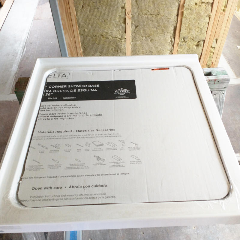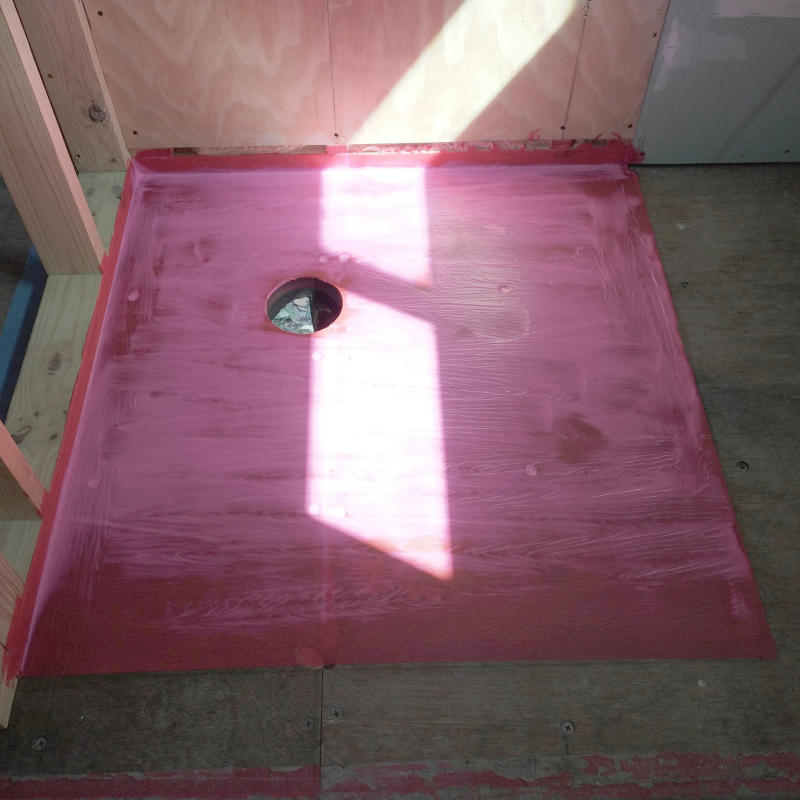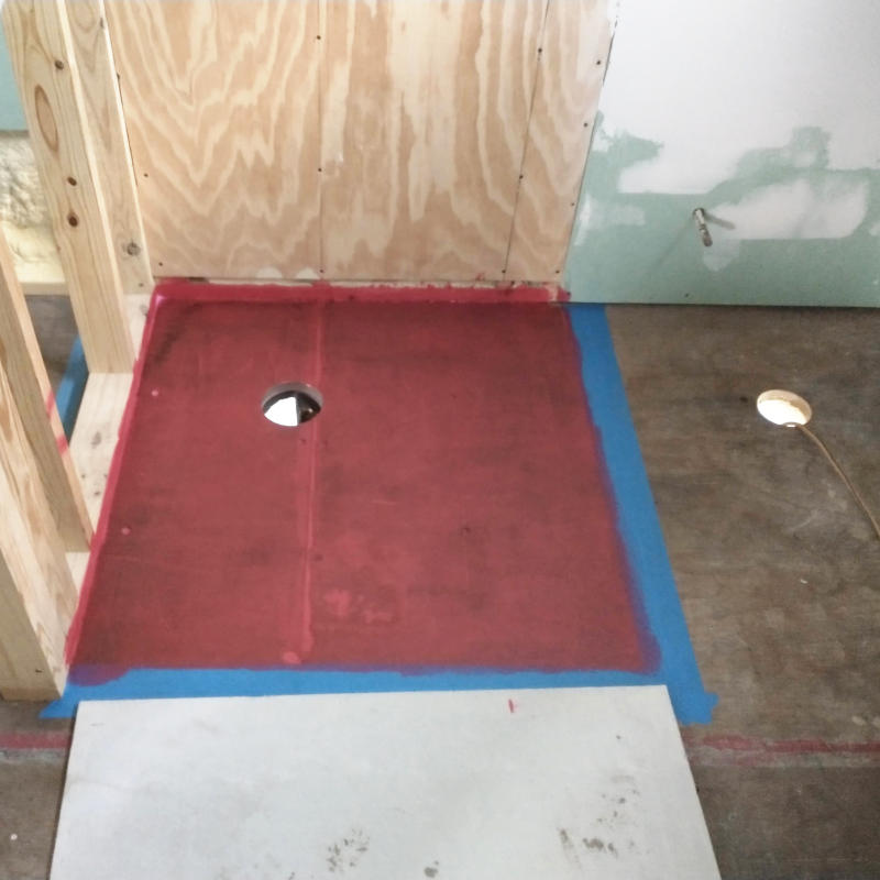 Next, the section under the shower base was measured out and then Red Guard was applied to help against moisture on the wood floor. Several layers of Red Guard were applied over a couple days to ensure the correct thickness was achieved.
