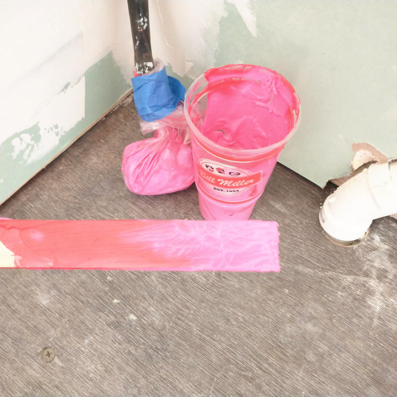 This stuff was crazy hot pink and thick like Elmer’s paste when applied and then dried into rubberized, dark red coating. It could be painted on, rolled on, our poured and spread out with a trowel. And for all the chemical product this is, it didn’t really have a smell.