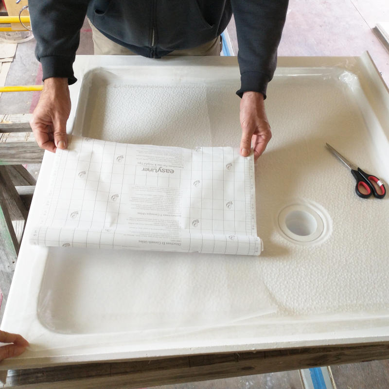Needing a way to protect the base from installation work, I came up with the idea of cabinet liners. Back in the days when I taught at a learning center, we used this plastic covering to keep the toddlers from tearing up and destroying their monthly name tags. I figured if this could handle 12 two year old children for 12 hours a day then it could handle our feet. For extra protection, I cut the cardboard box the base came in to fit just inside.