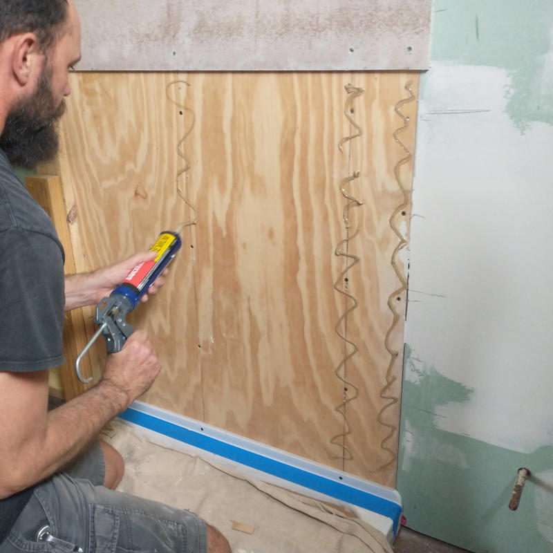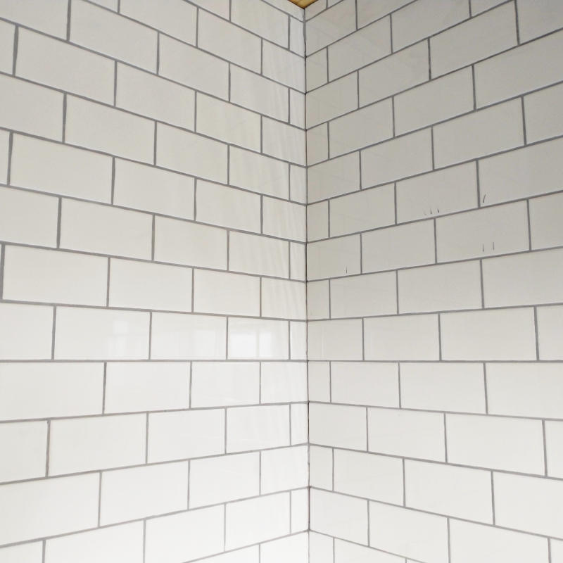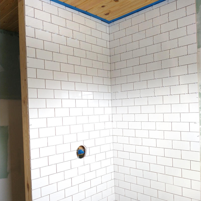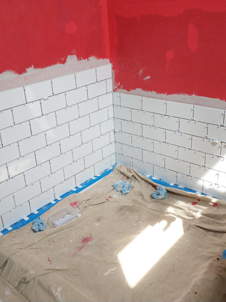 Applying Red Guard on a wall was just as easy as it was when laying it on the floor. A couple of layers later and a rest for at least 12 hours there was plenty of time to setup for tile work. Not having a clue as to the direction of tile desired, the three of us played with random designs and then gave a pros/cons list. This was done with herringbone both vertically and horizontally, horizontal with vertical bands at chest height, vertical with horizontal bands at chest height, vertical with two horizontal bands, horizontally with straight grout lines, horizontally starting in the corner working outward before deciding the tried and true subway tile pattern. Being limited to a small space all other patterns seemed too busy and the subway tile works best with tiles of this dimension pulling the eye out from the shower making it look larger. Classic. Simple. Easy.