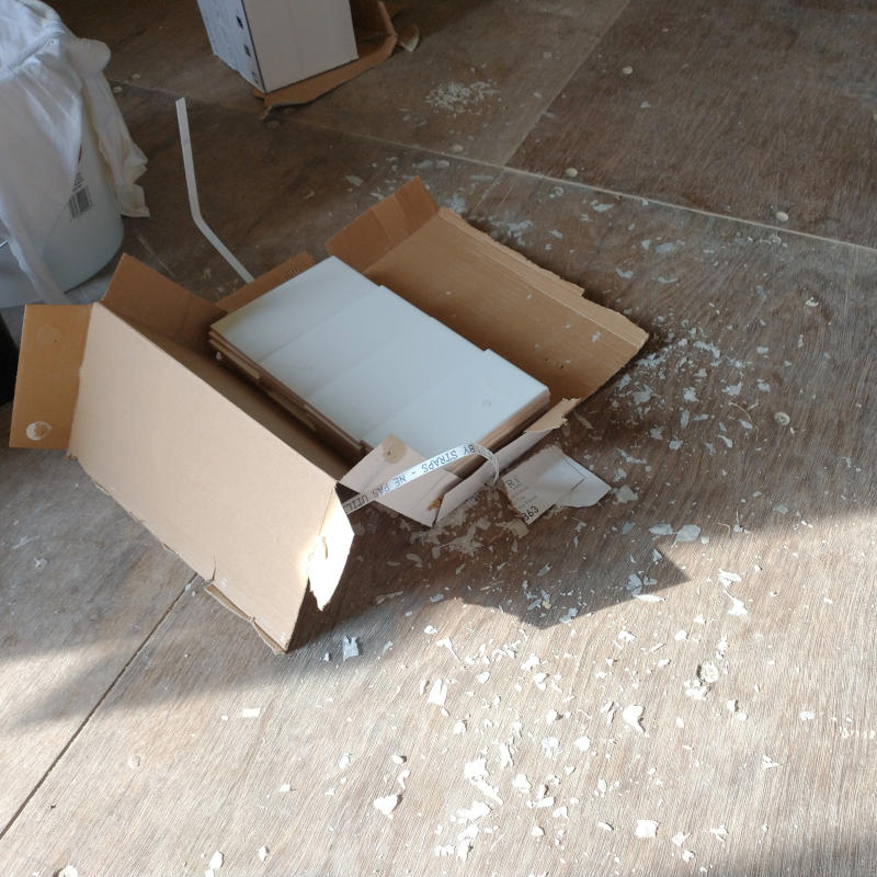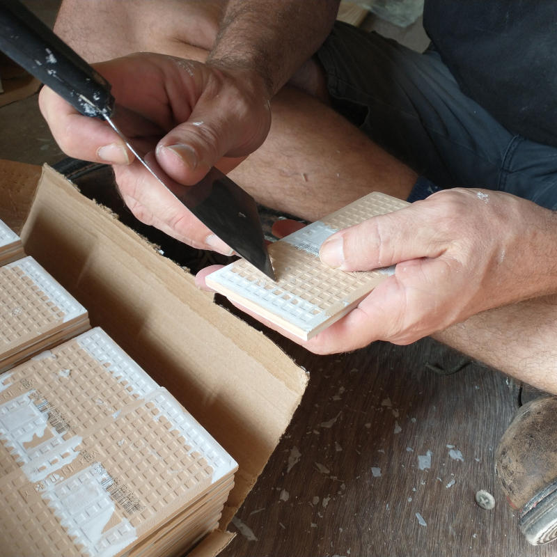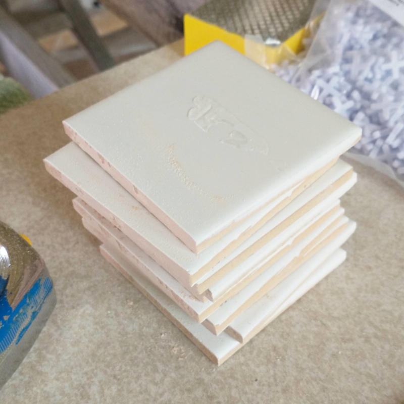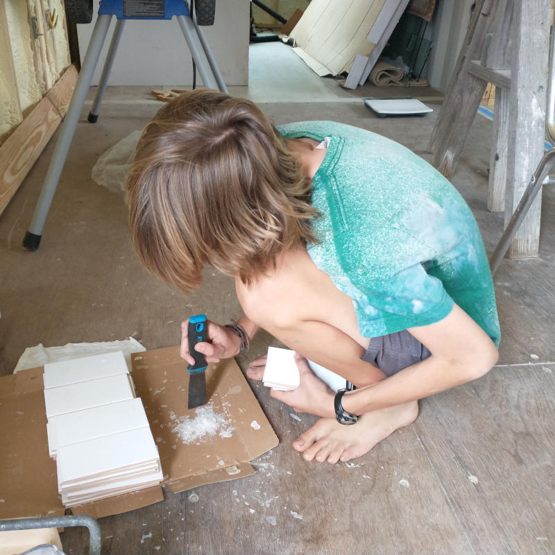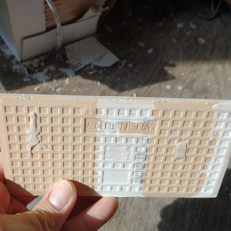 Then once all the tools are in place there is additional prep work. Boxed tile is separated with plastic or glue, something to keep the tiles from vibrating against each other during shipment. This separator pops off easily but if not careful, the scrapper will chip the edge of the tile resulting in a time consuming step requiring yet another tool.