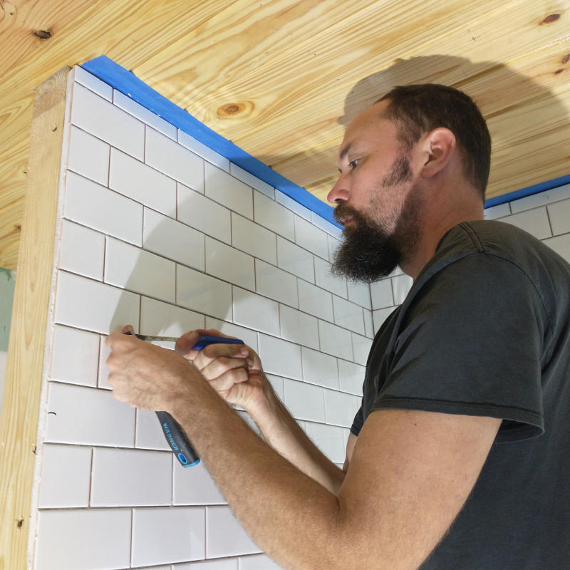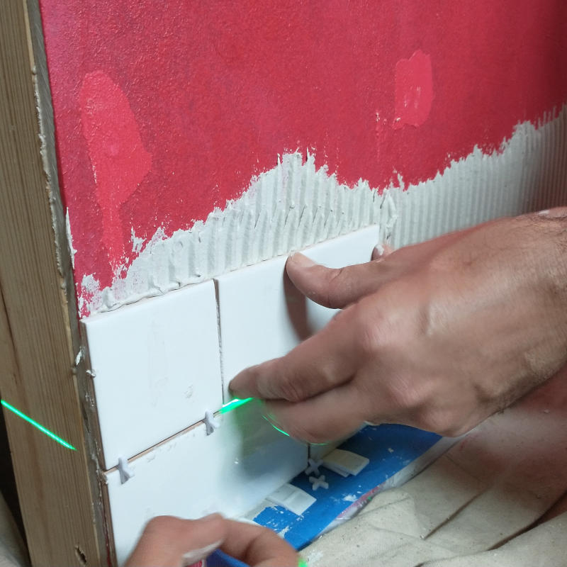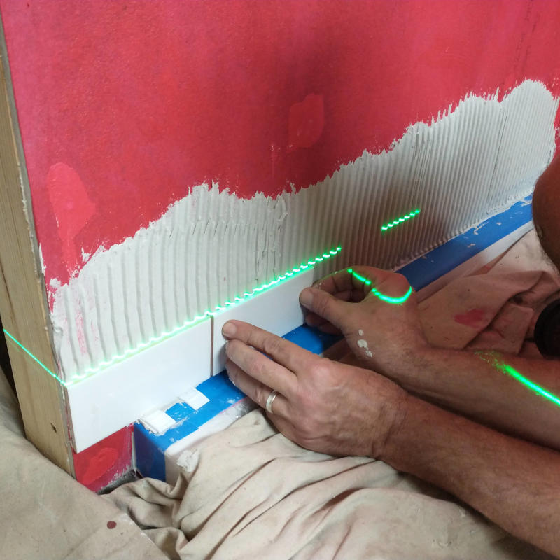 Only then after the tile is cut, cleaned, and applied with a thin layer of thinset are the tiles ready to be applied to the wall. Oh, wait. Then there are the tiles spacers determining the grout line thickness and tile levelers which we did not need as the Hardie board was installed correctly. Now, we are ready. Thinset walls and tiles, push into place, repeat until first row complete. Move laser, repeat. The trick is to apply a thick enough layer of thinset to push the tile into with pushing out between the tile all while not running to far above or ahead of the tile line as the thinset dries out.