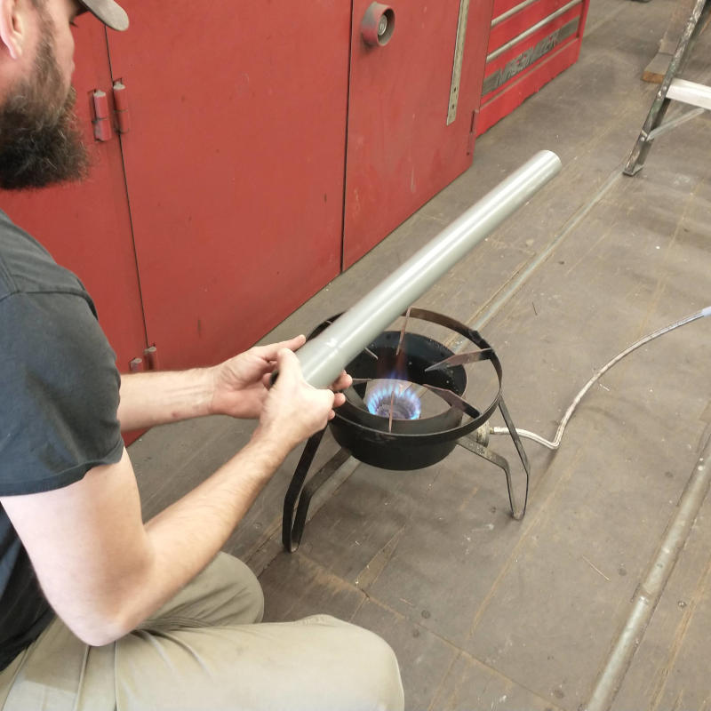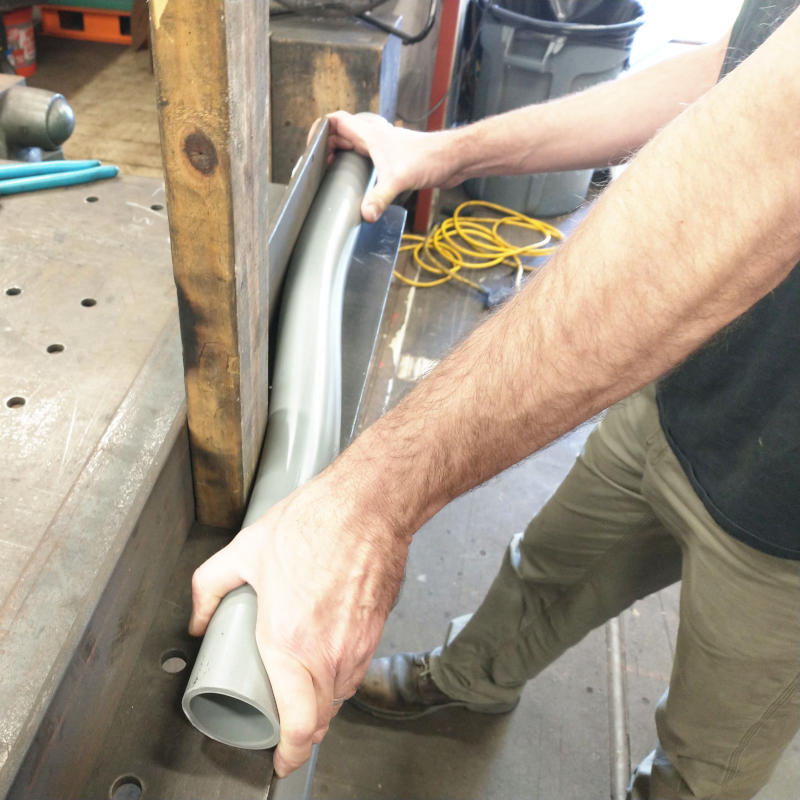 Using the outdoor propane burner, a four foot 2″ PVC was formed into the correct shape to attach the electrical junction box in the water heater room to the electrical line from the power pole. Not ever having done this, the procedure was simple enough if you took your time. Manipulating the PVC to get warm but not melt or burn is slow process. The PVC must be rotated without twisting and then once warm must be secured into place while it cools. A couple of more tweaks and it fit correctly.